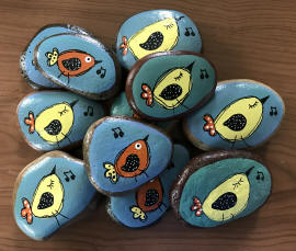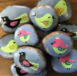 Some of the fun bird rocks I've painted and hidden for others to find: